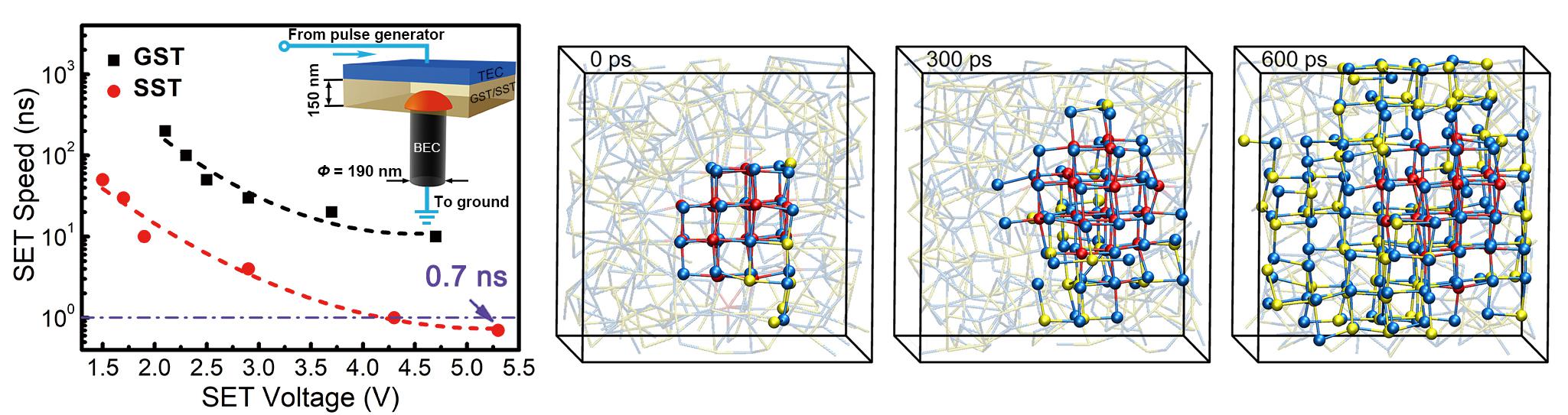 钪锑碲(SST)PCRAM器件~0.7纳秒的高速写入操作,较传统锗锑碲(GST)器件快10倍,及其微观高速结晶化机制。