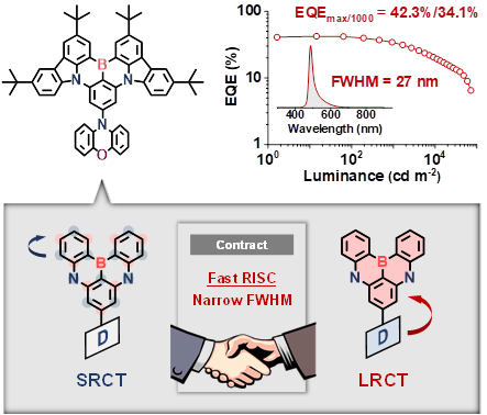 The development of organic electroluminescent materials and devices with narrow-band emission has emerged as a critical requirement to meet the demands of high-definition displays while maintaining the competitive edge of organic light-emitting diode (OLED) technology. Among the research endeavors in the field of organic electroluminescence, materials based on multiple resonance thermally activated delayed fluorescence (MR-TADF) have attracted substantial attention due to their advantages of narrow-band emission and high efficiency, owing to their rigid frameworks and unique short-range charge transfer (SRCT) properties. However, these materials suffer from a characteristic drawback, namely a sluggish reverse intersystem crossing rate (kRISC), which results in substantial efficiency roll-off at high luminance levels in corresponding OLED devices, thereby hindering their practical applicability.