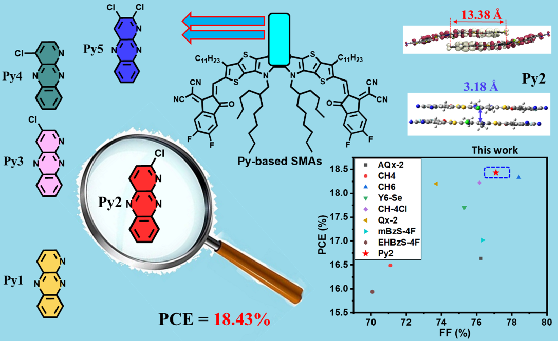 In view of this, the team of Professor Chuluo Yang and Professor Xiaosong Cao from Shenzhen University developed a series of SMAs withpyrido[2,3-b]quinoxaline (PyQx)as new electron-deficient unit by combining with the strategy of cascade chlorination, namely Py1, Py2, Py3, Py4 and Py5,and systematically investigated the influence of the position(ortho,metaandpatapositions of the N atom in the pyridine)and number (ranging from 0 to 2) of chlorine atoms in PyQx on the physicochemical properties, molecular packing and device performance of SMAs. In general, the introduction of chlorine atoms reduces the intramolecular charge transfer effects but elevates the LUMO energy levels. The binary organic solar cells (OSCs) based on PM1:Py2 yields a PCE of 18.43%, significantly higher than those based on PM1:Py1 (11.78%), PM1:Py3 (16.15%), PM1:Py4 (7.40%) and PM1:Py5 (15.87%). Importantly, density functional theory(DFT) reveals that Py2 with ortho chlorine substituted PyQx and Py5 with two chlorine atoms yield larger dipole moments and smaller π∙∙∙π stacking distances between two end groups, as compared with the other three acceptors. Moreover, Py2 shows the strongest light absorption capability induced byextendedorbitoverlap lengthsand more efficient packing structuresin the dimers. These features endow the best device performance of Py2 with high fill factor (FF) and short-circuit current density (JSC).