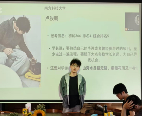 First of all, Feng Peng emphasized the importance of obtaining information about the postgraduate entrance examination and elaborated in detail on various ways to acquire such information. Subsequently, Senior Lu Junpeng shared his experience of applying to Southern University of Science and Technology, elaborating in detail on the re-examination process, English assessment, professional course tests and key points of the interview, and suggested that candidates establish contact with their supervisors in advance. Finally, Hu Lingzhi, a senior student, systematically sorted out the application strategy of South China University of Technology.